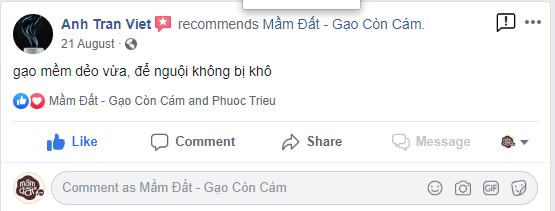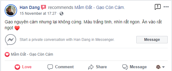 “Trong một lần đi ăn ở nhà bạn, chị ăn được bữa cơm rất ngon. Mà nhé ngon không phải vì thức ăn đâu, mà ngon vì gạo ý. Chị cảm tưởng cơm này ăn với nước mắm cũng ngon ý. Hỏi bạn chị thì được biết đây là dòng gạo còn cám cao cấp, không chỉ ăn ngon đâu mà còn có rất nhiều dưỡng chất đặc biệt là vitamin nhóm B, cực tốt cho việc kích thích tiêu hóa, chống lão hóa và nhiều bệnh tuổi già như thấp khớp, gout, suy thận.... ”